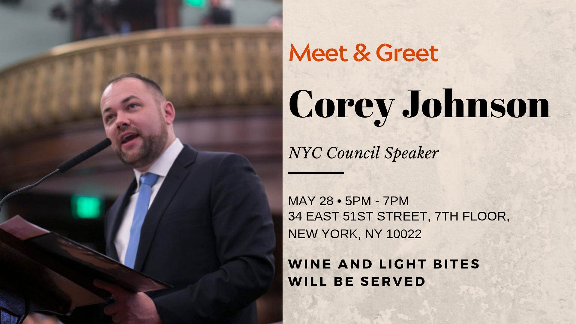 Please note that this a meet and greet and NOT a fund-raiser, so please do not bring any checks to the event. However, Corey welcomes contributions up to $250 on his website: https://www.coreyfornyc.com/. HANYC encourages and highly appreciates any and all contributions (only personal funds permitted). If you do make any contributions, please do notify us via email at Sandy@hanyc.org. Thank you!